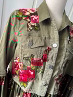 The structured top contrasts beautifully with the gathered floral fabric that flares out at the waist and sleeves, creating a soft, feminine silhouette. A perfect balance of rugged and refined, this upcycled piece transforms a classic jacket into wearable art—ideal for those who love statement craftsmanship and sustainable style.