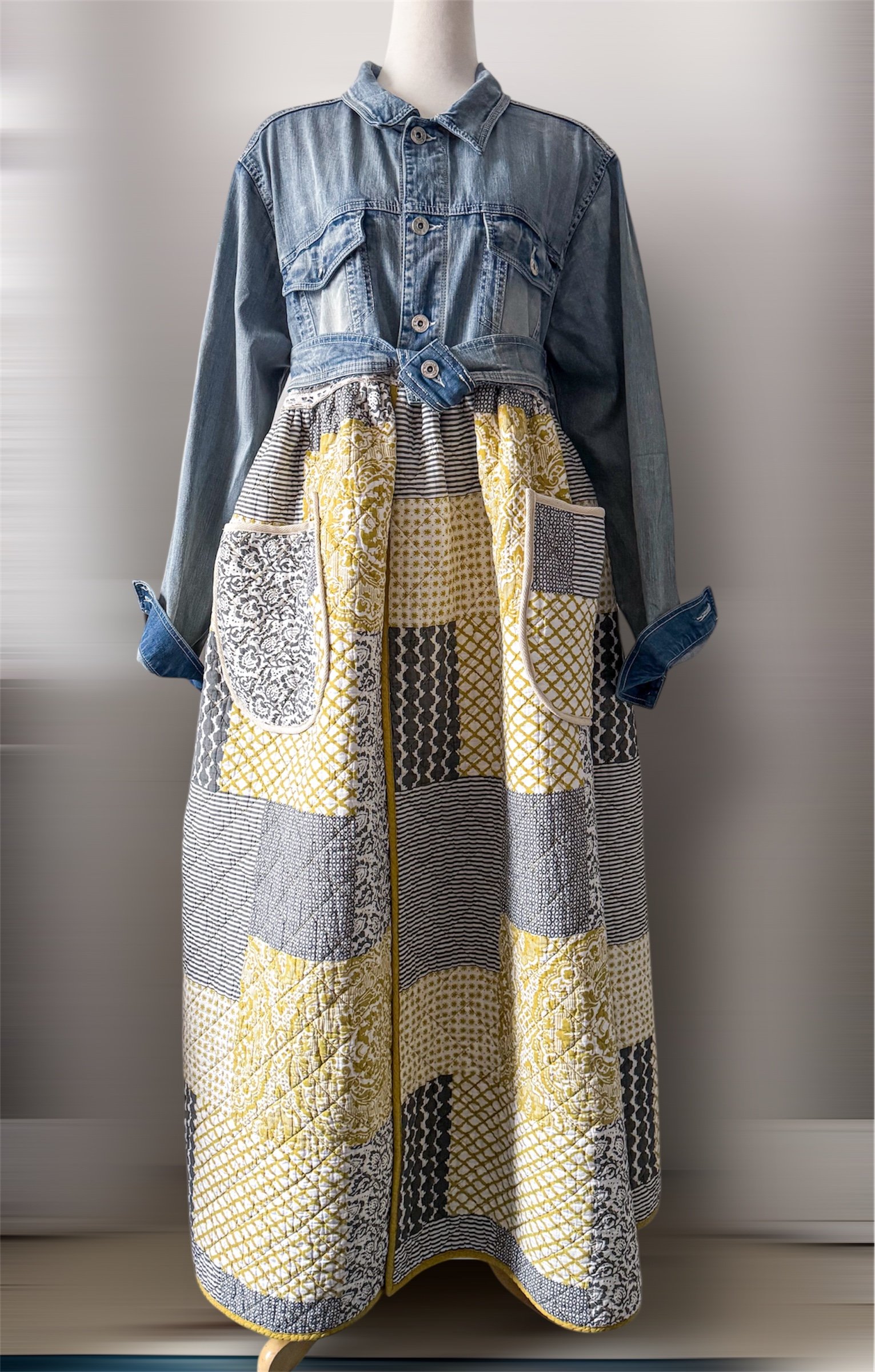This one-of-a-kind repurposed denim and quilt maxi jacket is a true wearable piece of art, blending vintage charm with modern, slow-fashion style.
