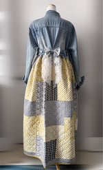 Flowing from the waist, a beautifully crafted cotton quilt bottom adds warmth, texture, and movement. The patchwork showcases a harmonious mix of mustard yellow, soft greys, and delicate prints, creating a cozy yet eye-catching statement. Thoughtfully placed oversized pockets add both function and character.