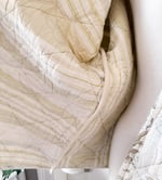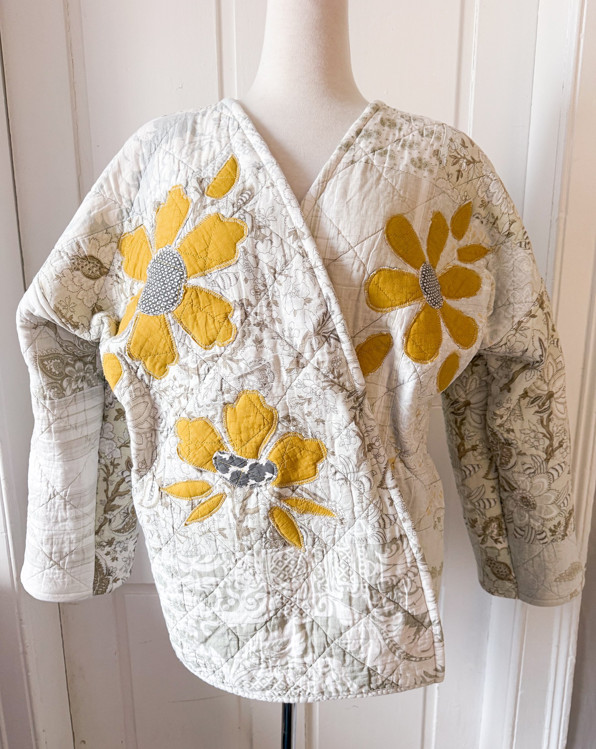 Featuring stunning hand-pieced appliqué - piece by piece, the jacket showcases oversized golden floral motifs that bring warmth and character to the soft, neutral quilt base. Each stitch tells a story, highlighting the care and craftsmanship that went into transforming these materials into a wearable work of art.