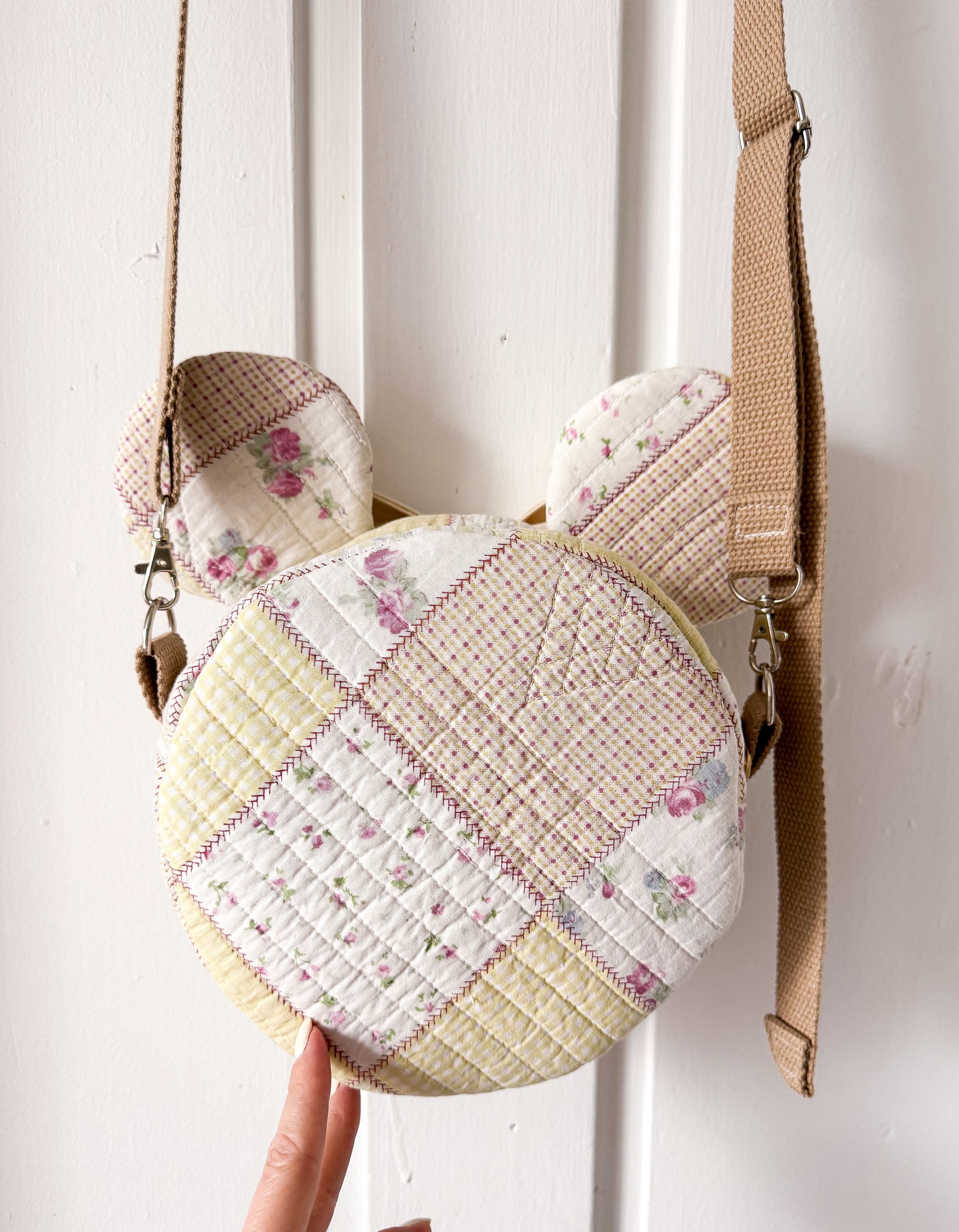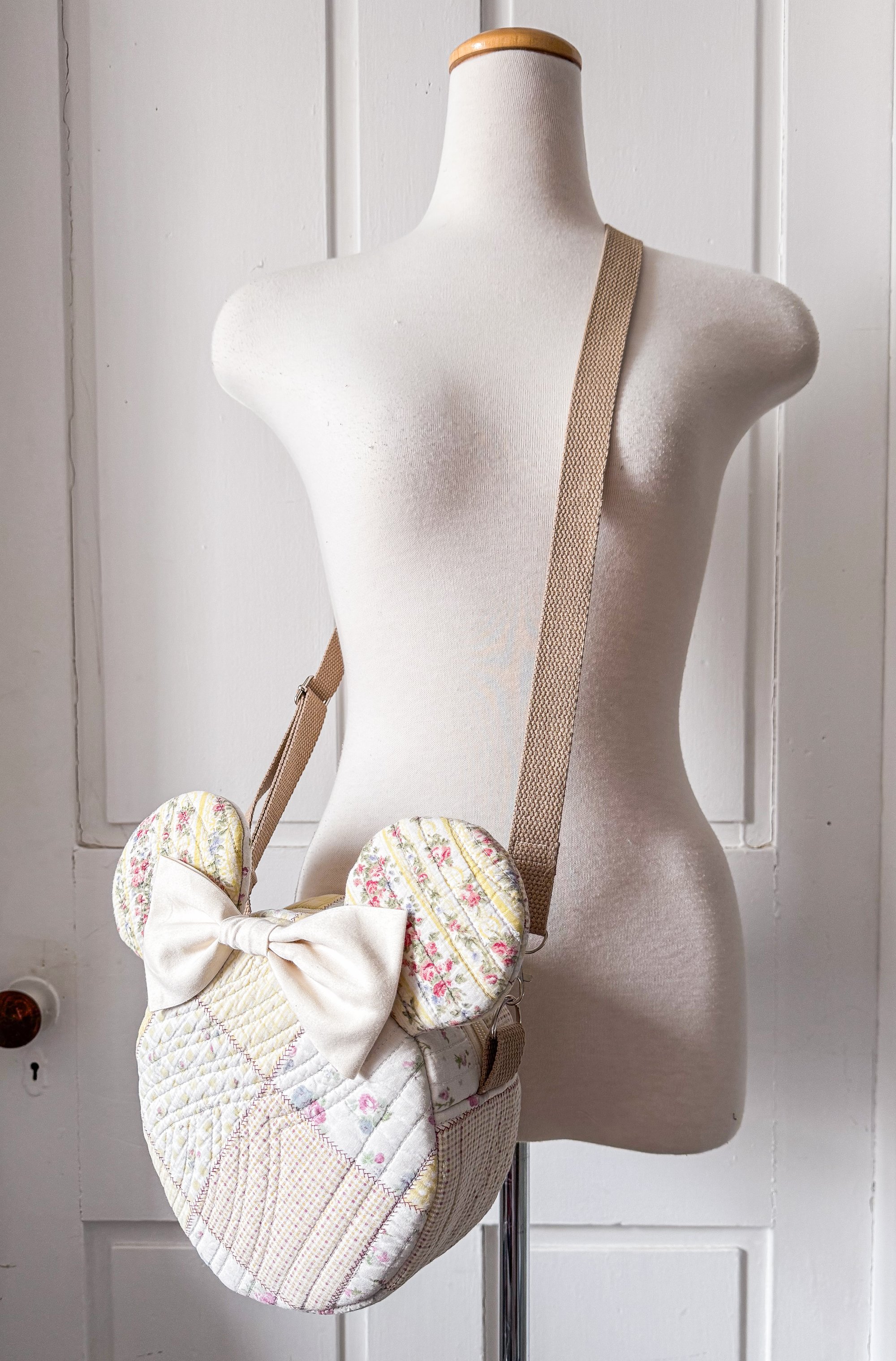 This one-of-a-kind handmade shoulder bag is crafted from upcycled cotton quilt pieces, giving it a soft, nostalgic charm with a beautifully textured finish. Designed in an adorable mouse silhouette, it features rounded quilted ears and a statement oversized bow in a creamy neutral tone for a sweet, vintage-inspired look.