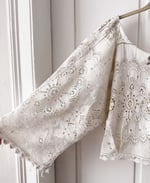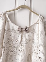 Finished with a sweet cotton bow at the center front, this top feels both heirloom-inspired and effortlessly wearable. The lace showcases intricate floral motifs throughout, with subtle variations and imperfections that make each detail unique. Lightweight and airy, it layers beautifully or stands alone as a statement piece.