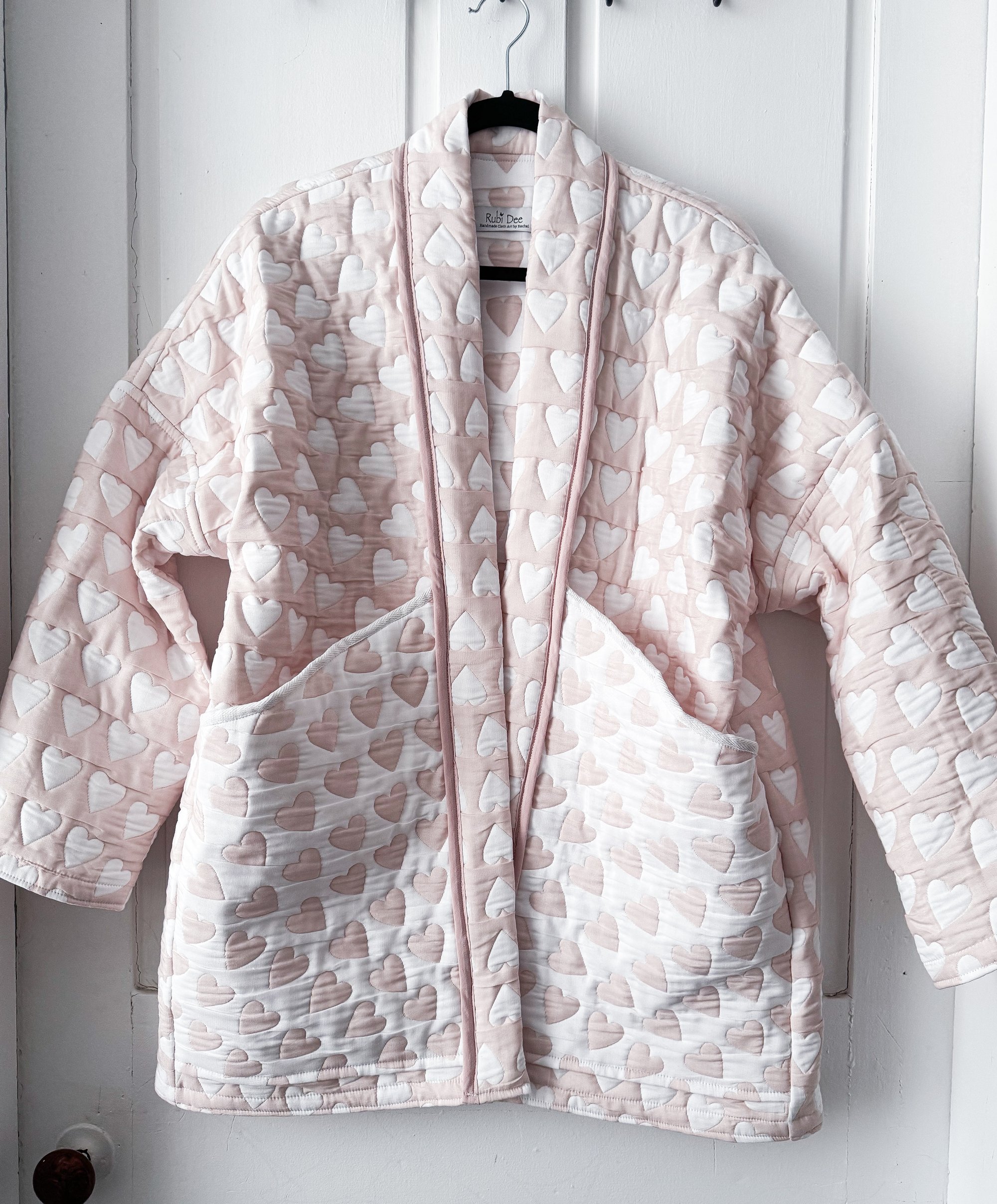 This handmade heart quilted coat is a soft statement piece designed for cozy layering. Crafted from a cotton and polyester blend, it combines the breathability of cotton with the durability and easy care of polyester. The pale blush pink base is accented with an all-over heart pattern, giving it a romantic, playful feel that still feels timeless.