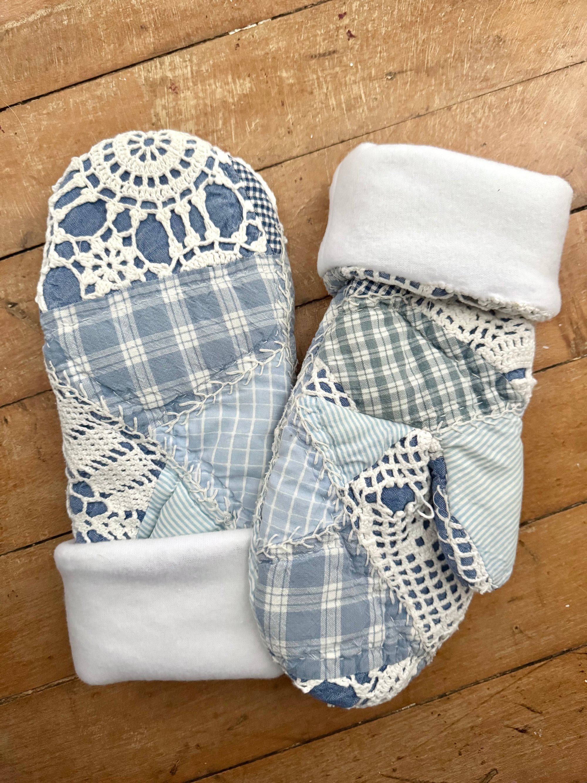 These crochet cotton fleece-lined mittens combine vintage charm with cozy comfort. Made from a patchwork of soft blue cotton fabrics accented with delicate crochet lace details, each mitten has a unique, handmade character.