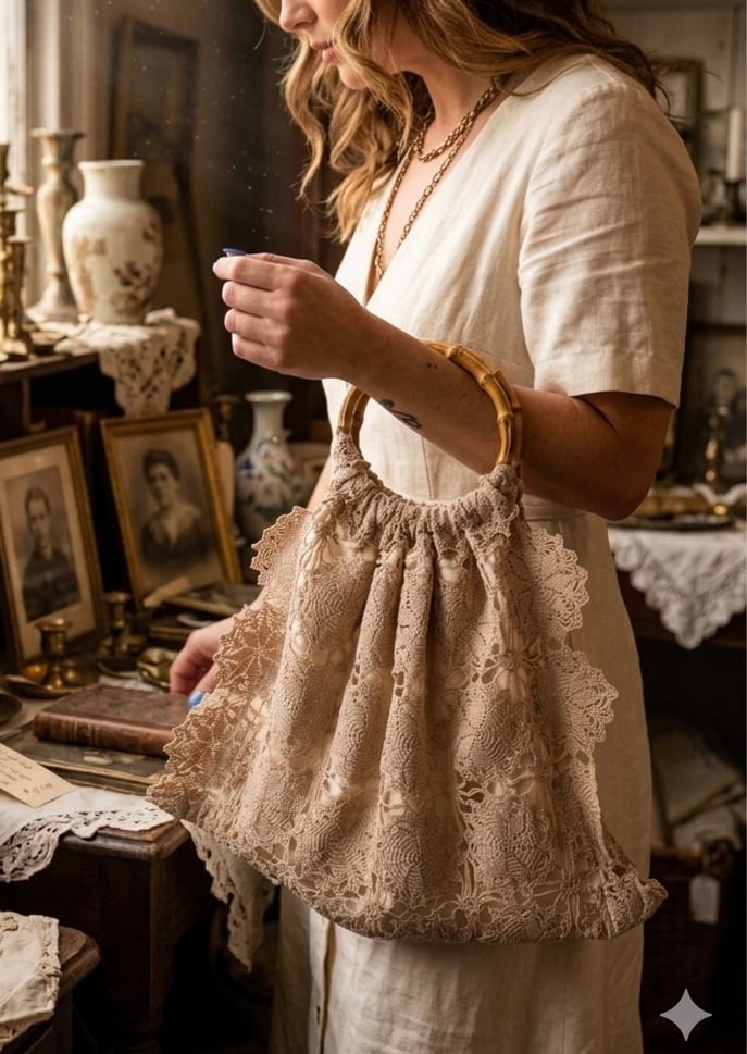 This stunning upcycled market bag breathes new life into vintage doily lace, transforming intricate, time-honored handiwork into a functional piece of contemporary wearable art.