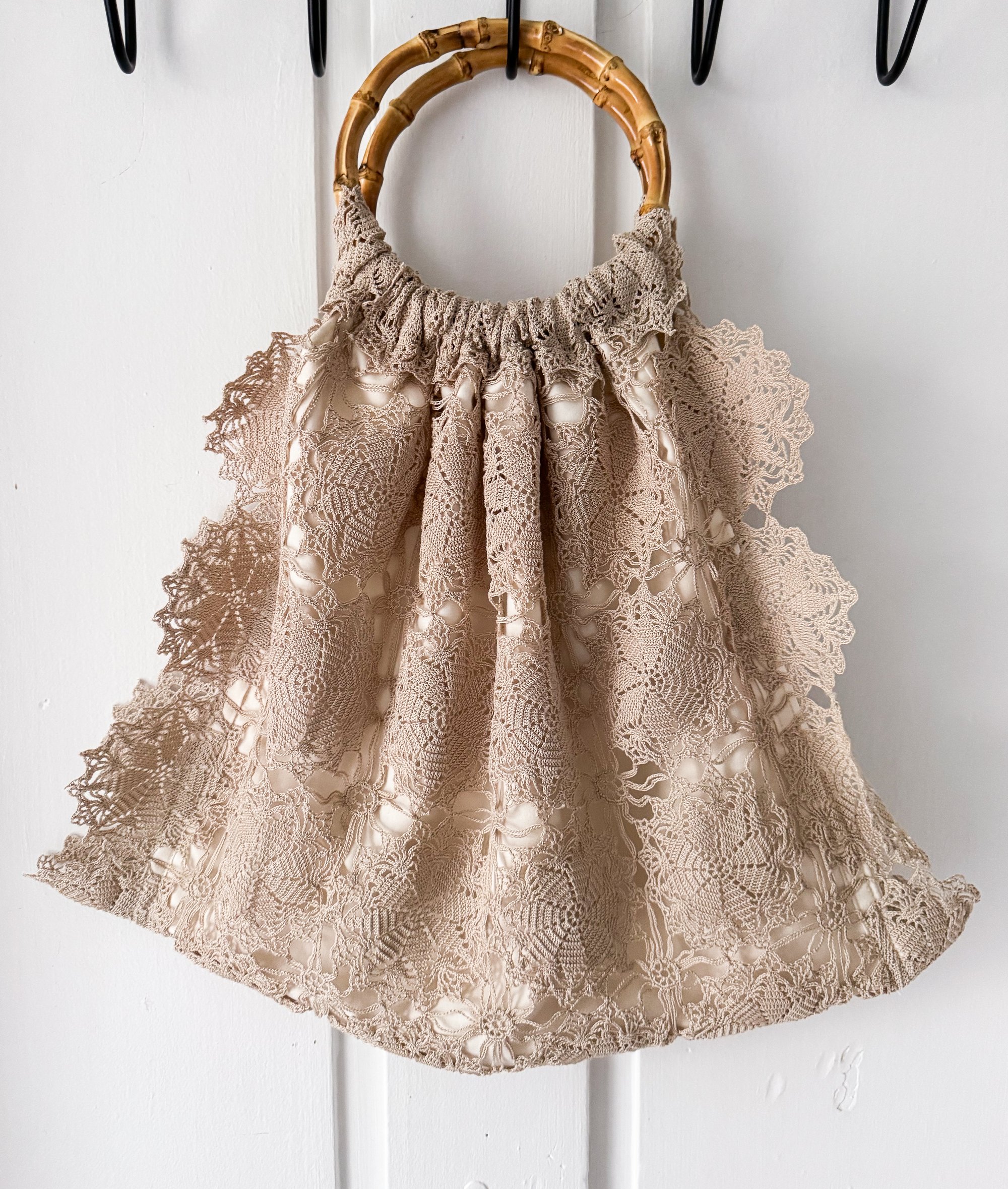 Each bag is a one-of-a-kind creation, featuring delicate layered doily lace in a soft, sandy neutral palette that perfectly captures a romantic, bohemian aesthetic.