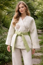 Designed with a flattering cross-over front, this jacket drapes effortlessly across the body and is secured with an oversized, statement belt in a fresh green tone. The belt not only defines the waist but adds a soft contrast that highlights the intricate quilting.