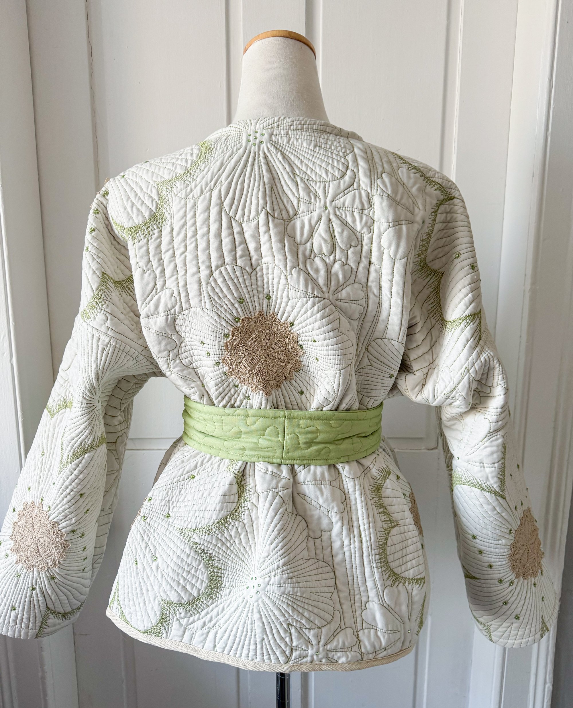 This one-of-a-kind handmade kimono-style jacket is thoughtfully crafted from an upcycled embroidered polyester quilt, adorned with vintage lace doilie appliqués. Overlayed and embellished with glistening matching mint green glass rhinestones that catches the light beautifully!