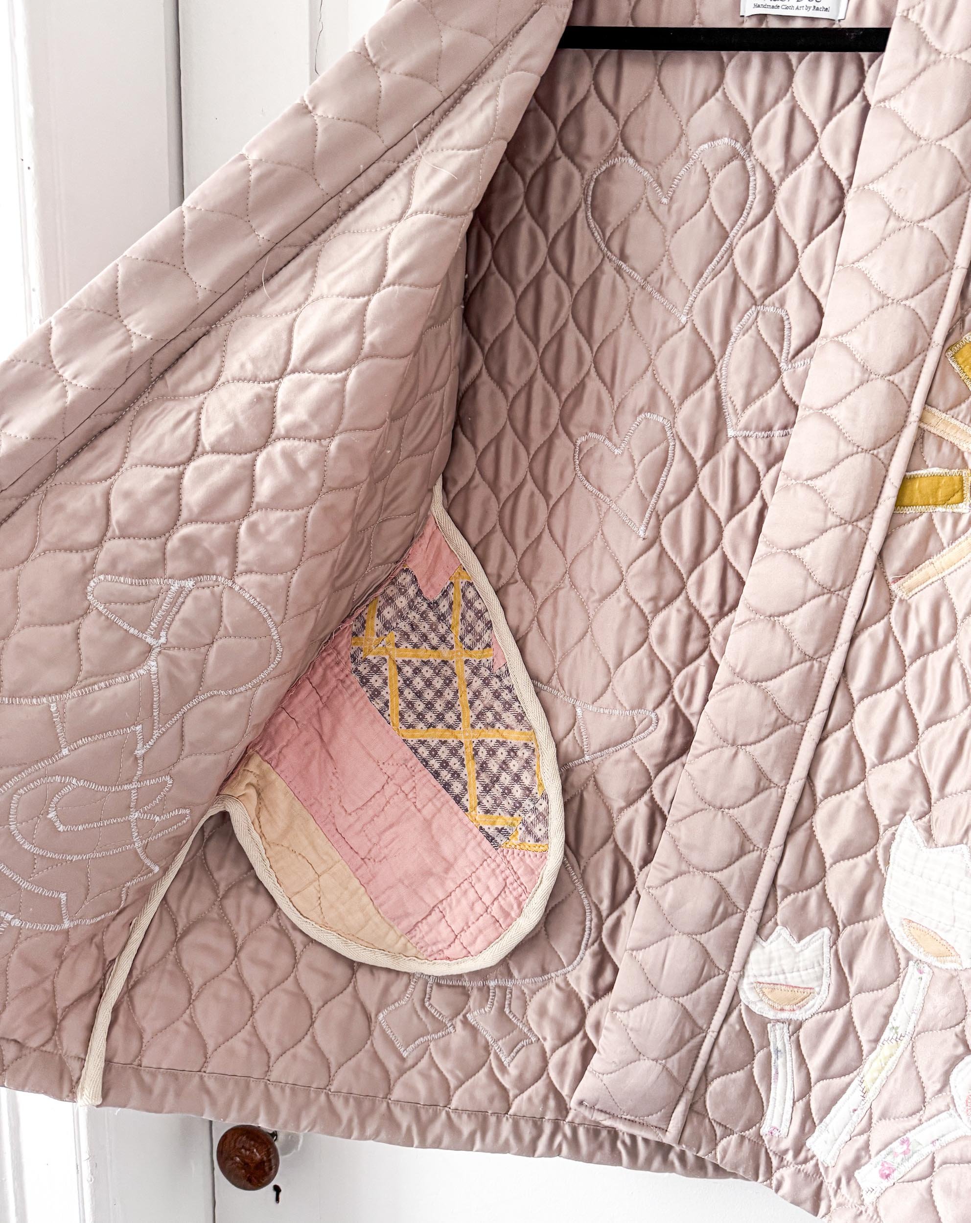 Wrap yourself in a storybook. This one-of-a-kind jacket is handmade from a shimmering blush sateen quilt, giving it a soft, romantic glow that catches the light with every movement.