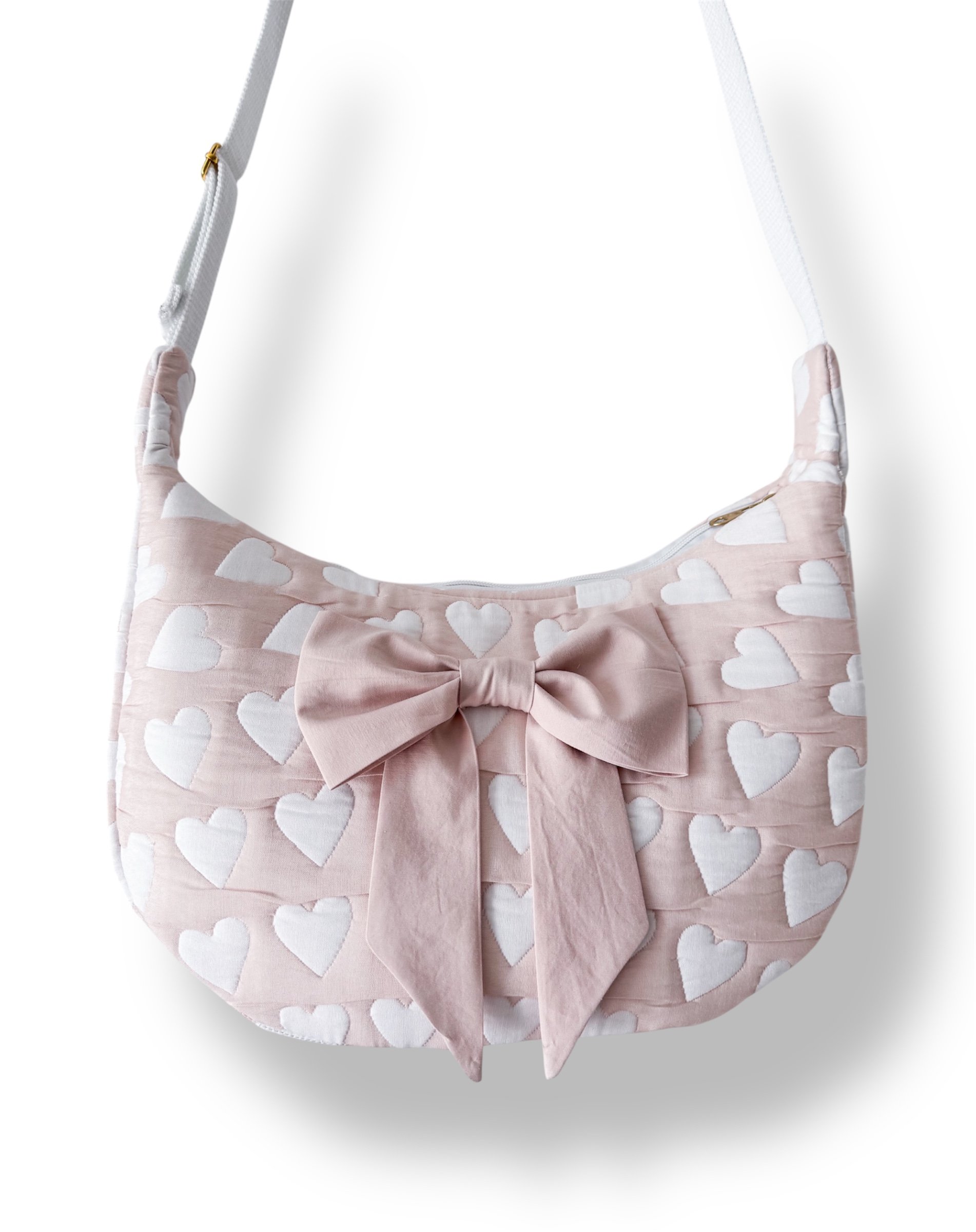 This crescent-shaped piece features a soft blush exterior adorned with a classic white heart motif, creating a look that is both playful and sophisticated.