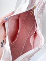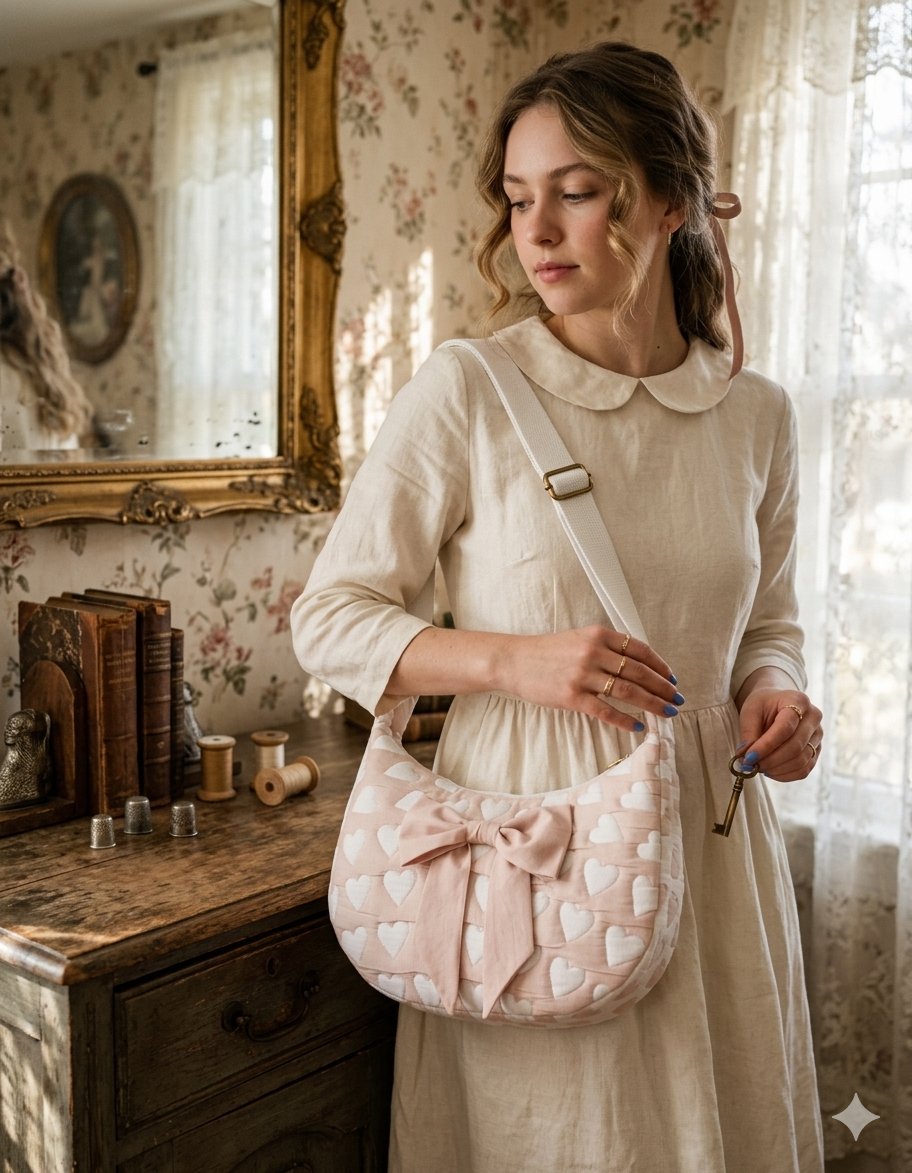 The exterior is crafted from a high-quality blend of 50% cotton and 50% polyester, offering the breathable softness of natural fibers paired with the resilience and wrinkle-resistance of synthetic materials. This quilted fabric ensures the bag holds its elegant "half-moon" silhouette even when fully loaded. It is a piece designed to handle the rigors of daily use while maintaining its delicate, "coquette-inspired" aesthetic.