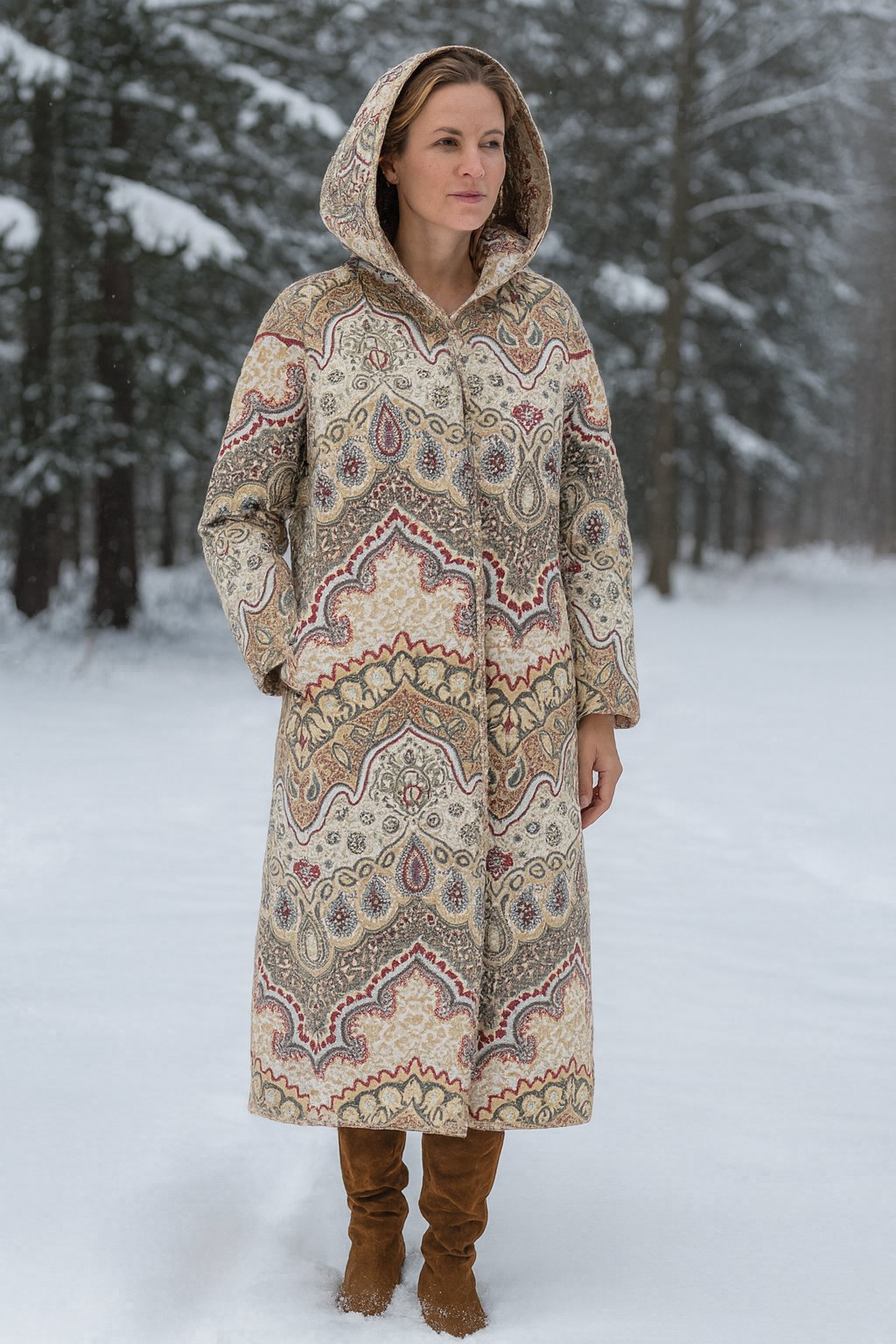Designed with a relaxed, straight silhouette, the coat falls gracefully to full length, creating an elegant, enveloping shape that’s perfect for colder weather. The generously sized hood adds both practicality and comfort, framing the neckline while offering extra protection from wind and chill. Long sleeves and a clean front closure keep the look streamlined, allowing the intricate quilted pattern to take center stage.