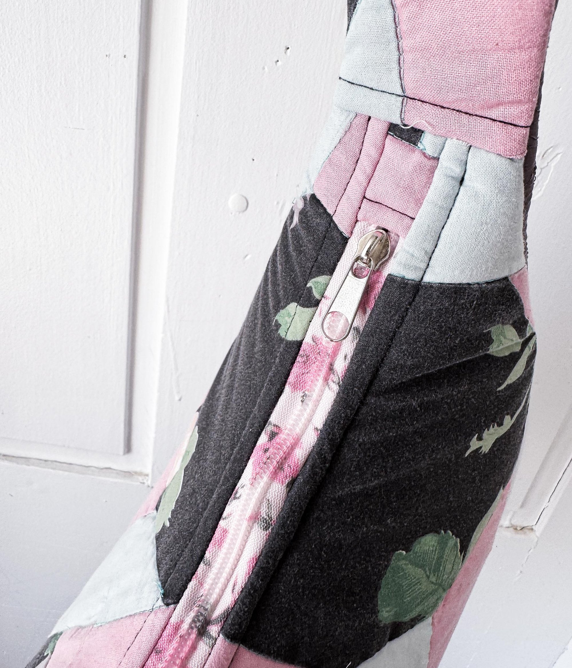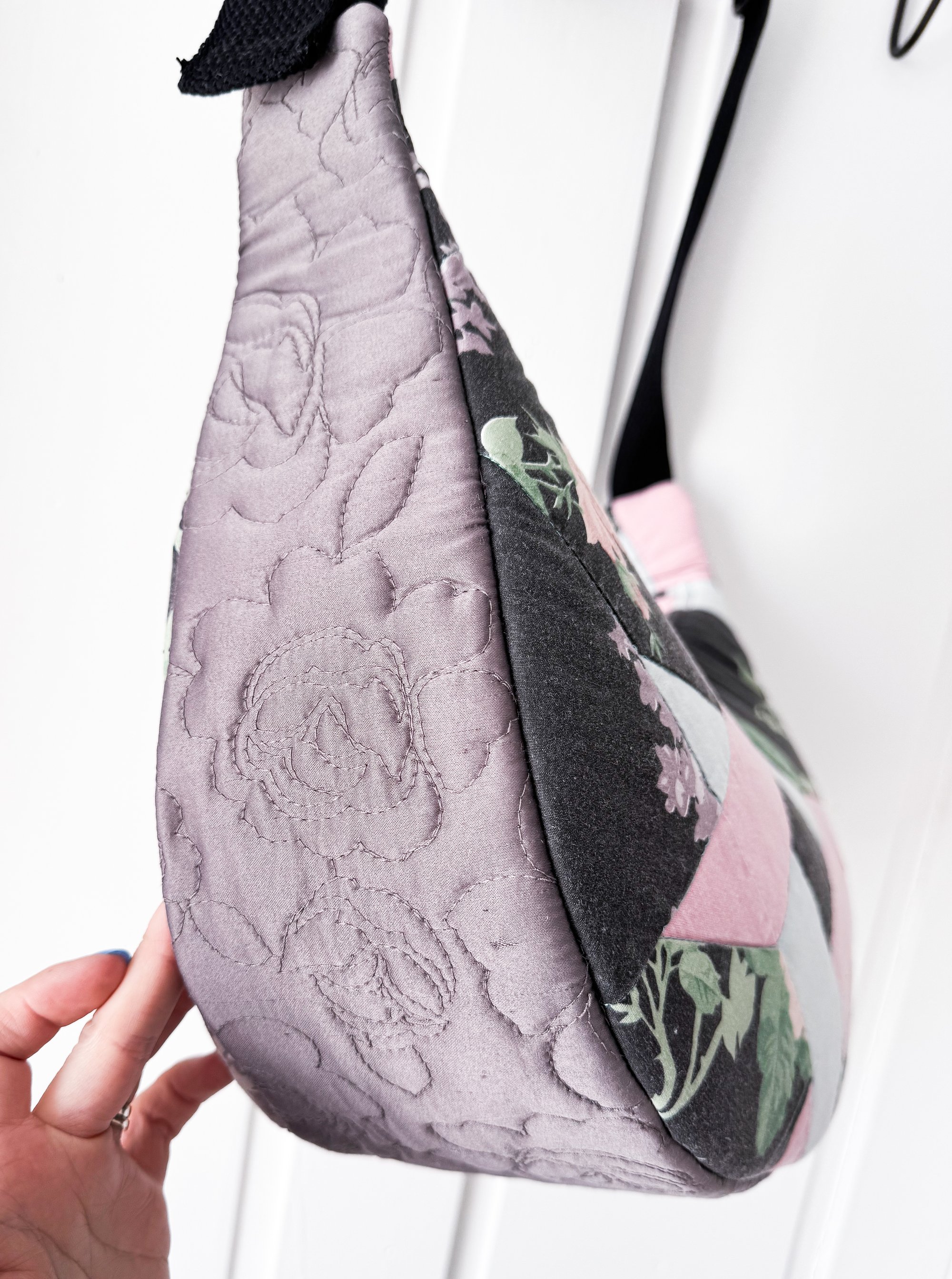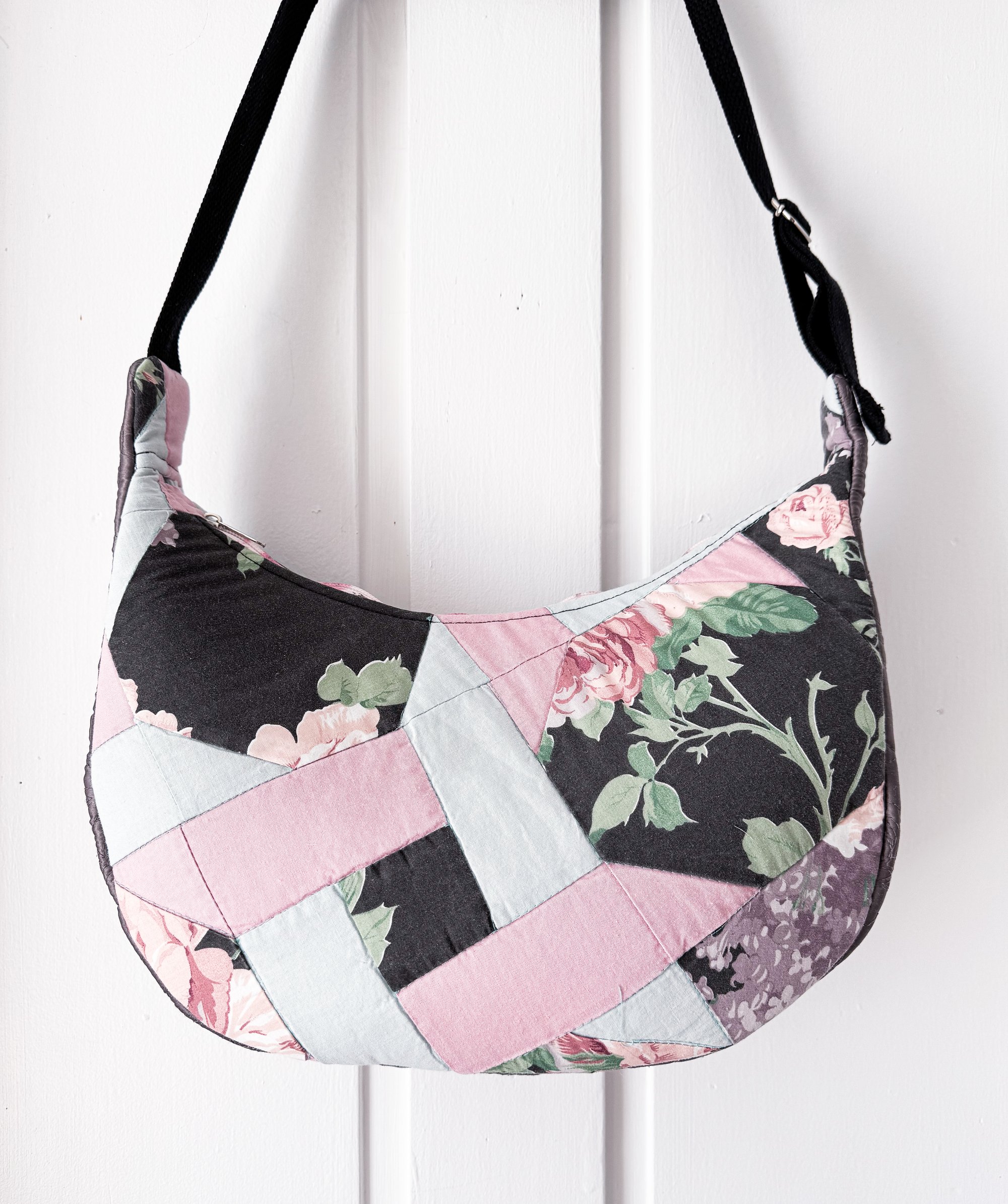 This crescent‑shaped shoulder bag is crafted from a beautifully repurposed quilt, blending soft florals, gentle pastels, and the comforting texture of hand‑stitched patchwork. Each panel carries its own bit of history, now reimagined into a functional, modern silhouette that feels both nostalgic and fresh.