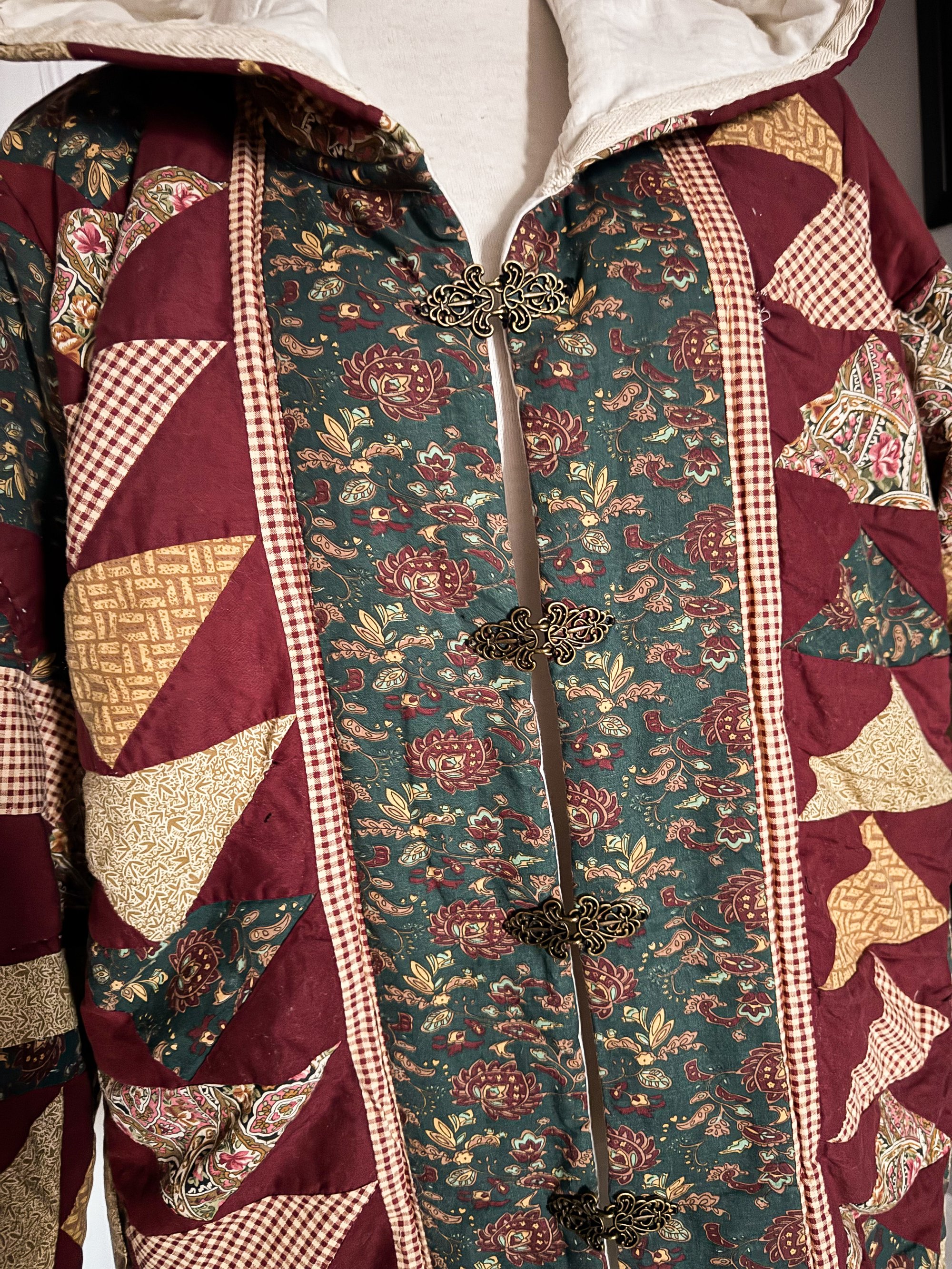 This one-of-a-kind upcycled cotton patchwork quilt coat is a true wearable heirloom. Crafted from richly patterned vintage quilt blocks in deep burgundy, forest green, and warm cream tones, it features a striking patchwork design balanced with floral and geometric prints.